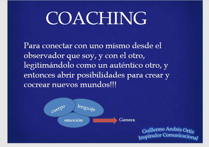 Desde mi mirada personal, elijo definir al “Coaching” como: “Proceso de conversaciones inspiracionales para potenciar la singularidad del Ser/estar siendo en pos de la transformación constante del Observador y entonces, abrir posibilidades para crear y co-crear Nuevos Mundos “…